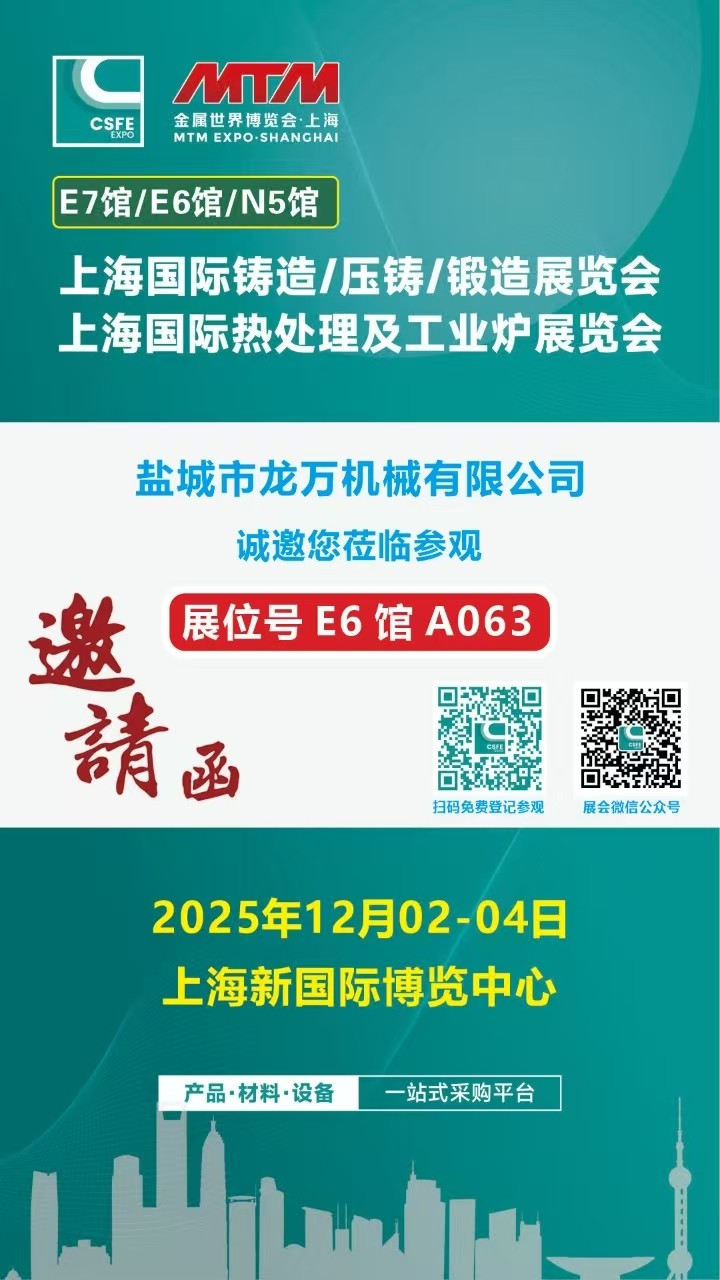 Lahok ang Yancheng Longwan Machinery Co., Ltd. sa "Shanghai International Steel/Die Casting/Foundry Exhibition" at ang "Shanghai International Heat Treatment and Industrial Furnace Exhibition" na gaganapin sa Shanghai International Expo Center mula ika-2 hanggang ika-4 ng Disyembre, 2025. Ang eksibisyong ito ay umaakit ng maraming nangungunang kumpanya mula sa steel, casting, at heat treatment. Gagamitin ng Yancheng Longwan Machinery Co., Ltd. ang platform na ito para ipakita ang mga pinakabagong teknolohiya at makabagong produkto nito sa larangan ng pagmamanupaktura ng makinarya.